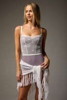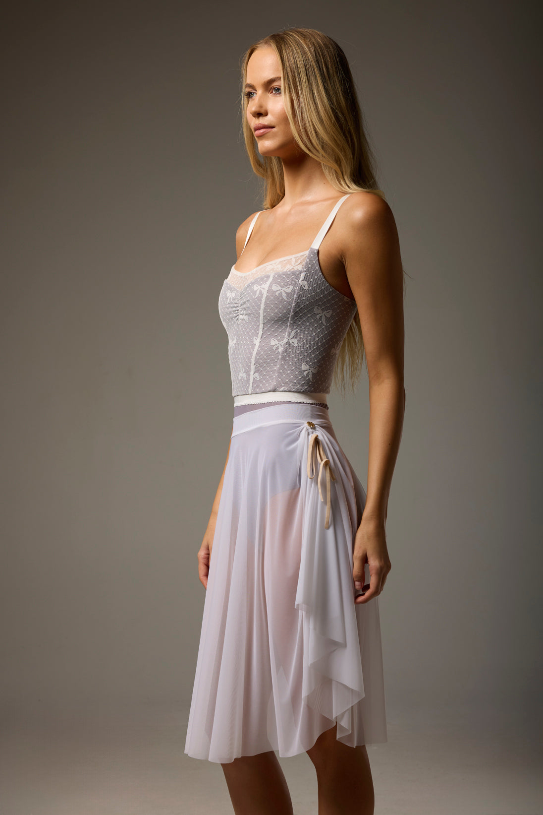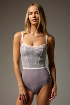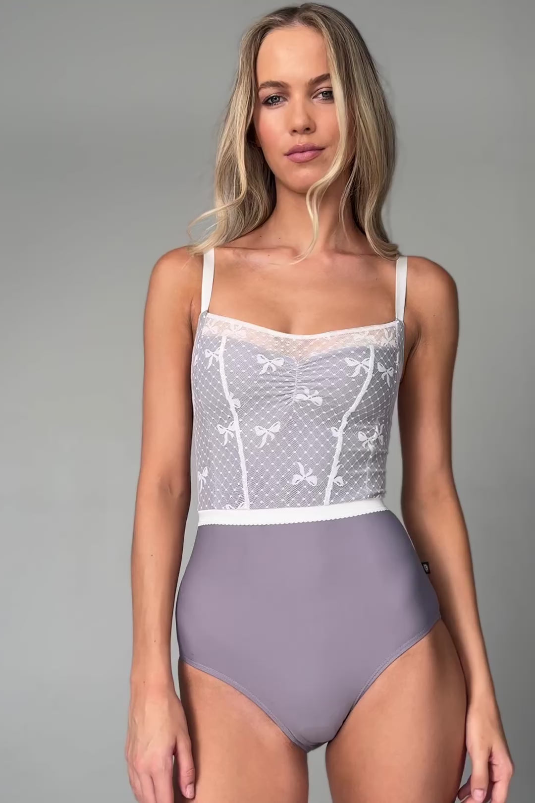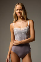 OPHELIA SERENADE camisole leotard features a Limited Edition mesh overlay bodice with delicate bow detail and pinch front with waist defining ribbon.