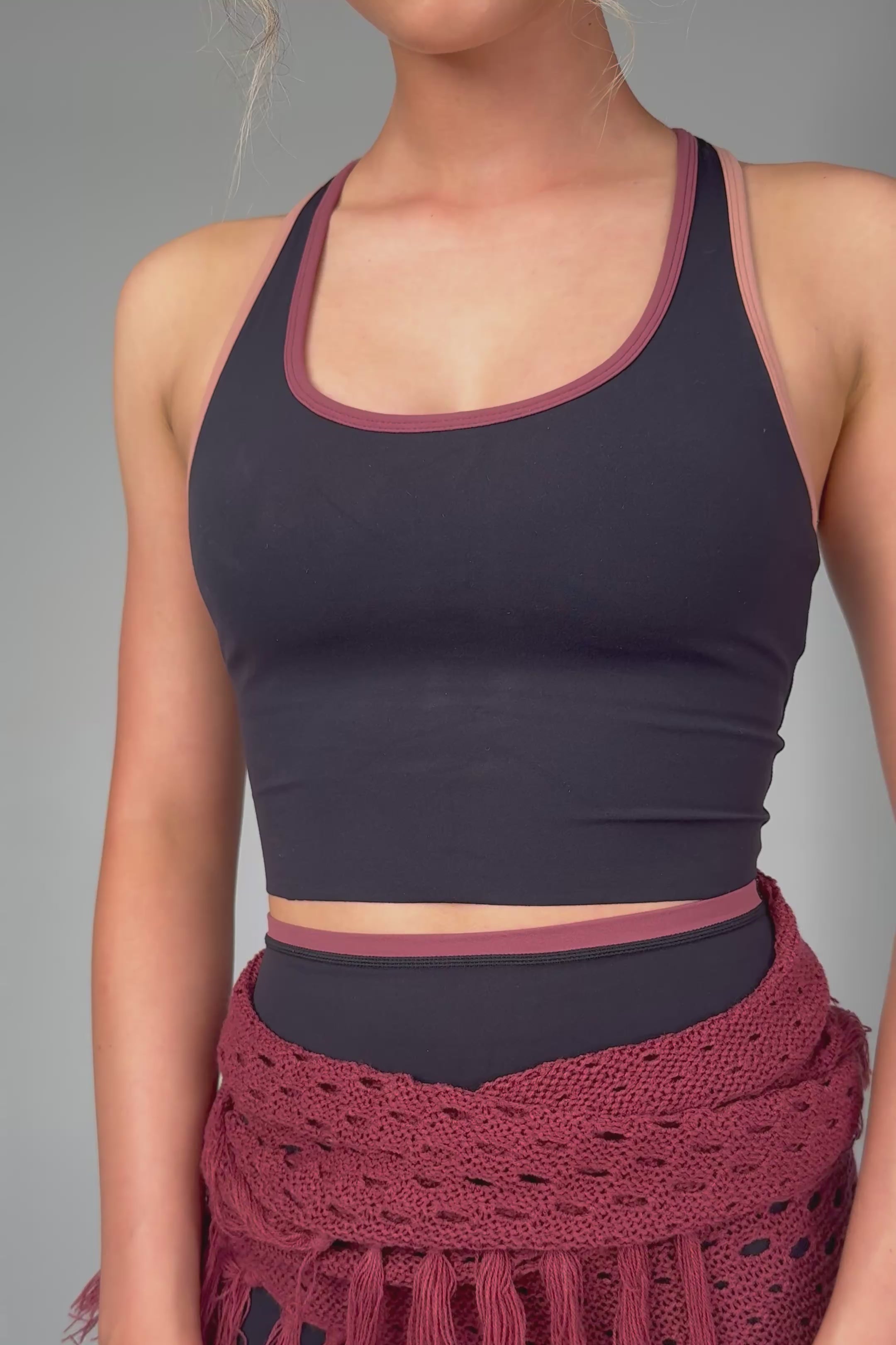 The ARIA racer back crop features a hidden, elasticated shelf bra with soft cups, scoop neckline and free-cut hem. The streamlined yet relaxed fit make this top perfect for ballet, barre, yoga and Pilates.