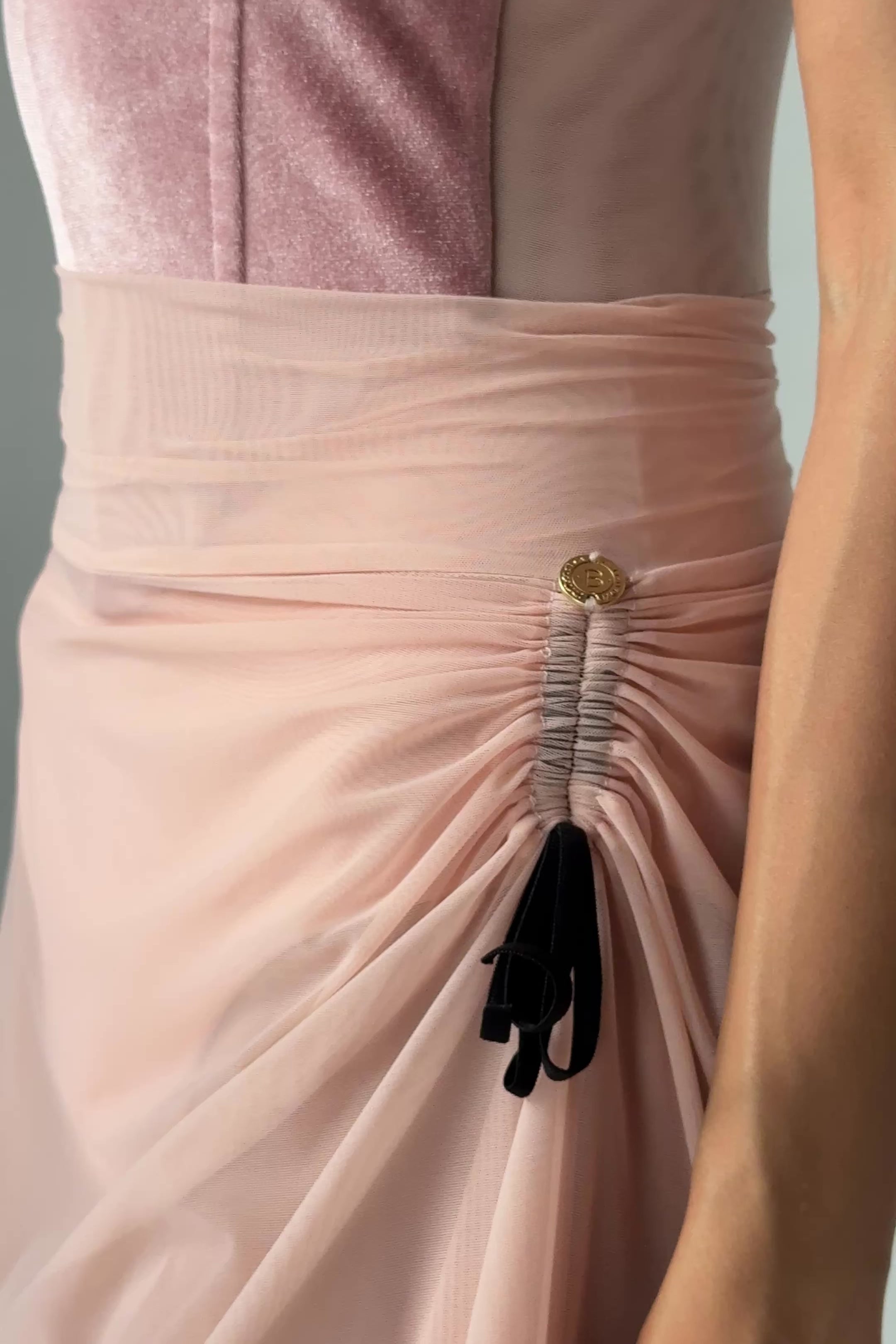 GISELLA has an elegant hi-low line and features ruching channels with ribbon for custom styling.